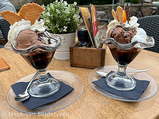 Toch was er op dat terras nog een lichtpuntje: de meer dan voortreffelijk sorbet met chocolade-ijs, “völle nutt’n” (veel noten) en “echte slagroom”.